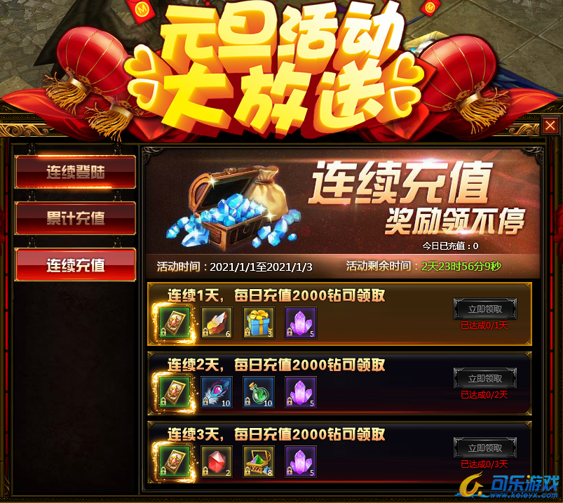 活动内容:活动时间内,玩家每日充值达到2000钻,即可获得丰厚奖励!