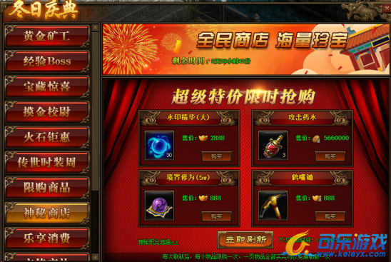 2.神秘商店每2小时自动刷新一次,也可用花费元宝立即刷新;
