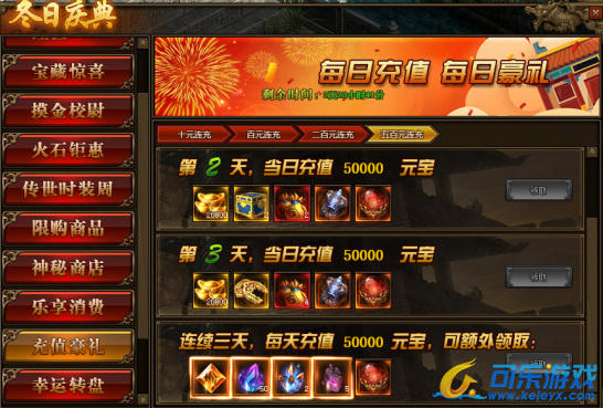 2.连续充值达到3天,奖励翻倍领,更可领取暗影晶石、地狱晶石、觉醒晶石等贵重物品