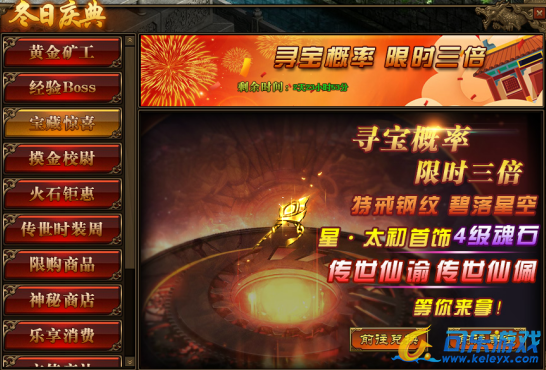 1.活动期间,玩家寻宝概率翻倍,极高几率获得星·太初首饰,传世灵器、传世灵甲,特戒钢纹,仙元石、碧落星空,传世灵器、传世灵甲,高级天魂石、四级魂石,传世灵器·仙谕以及传世灵器·仙佩