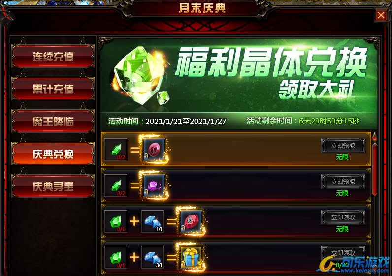 活动内容:玩家在日常挂机击杀小怪可获得小晶体,击杀野外BOSS、黄金BOSS、参与魔王降临活动可获得中晶体,使用不同晶体及钻石比例可兑换游戏中稀有道具,详情请根据游戏中活动兑换页面为准。