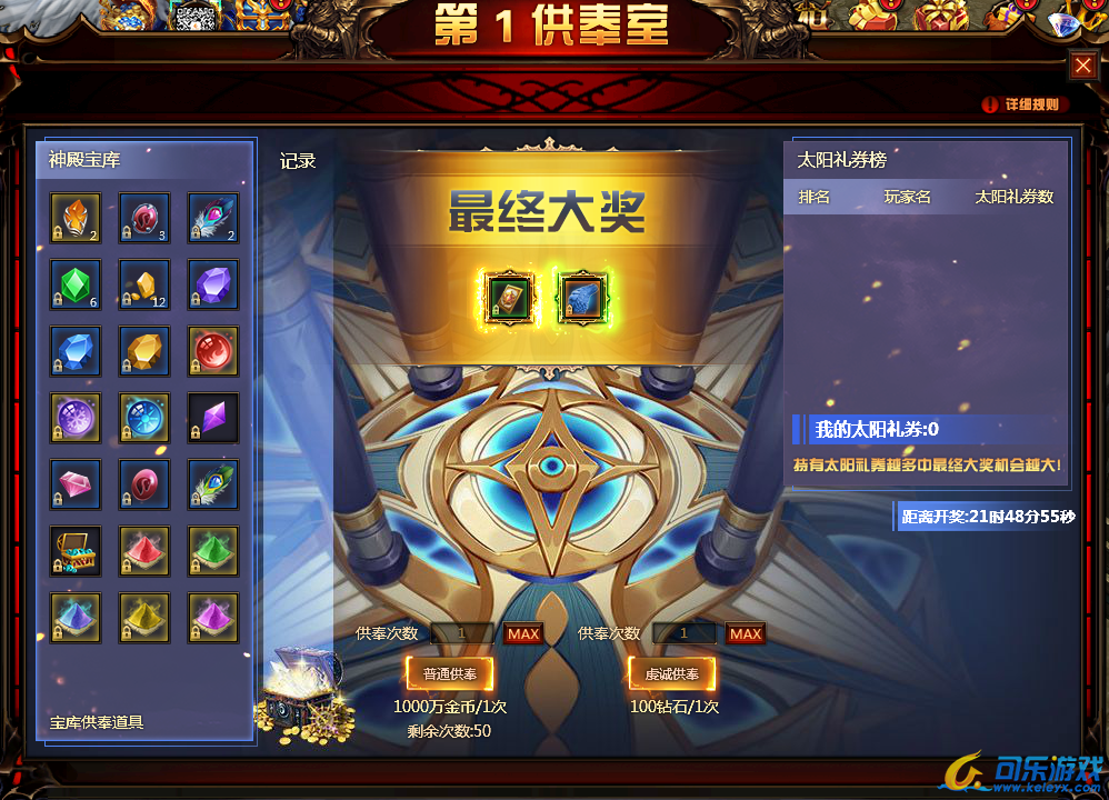 2.玩家可使用金币和钻石进行供奉,每次供奉后可获得奖池内随机一件奖励,只有使用钻石供奉可额外获得太阳礼券