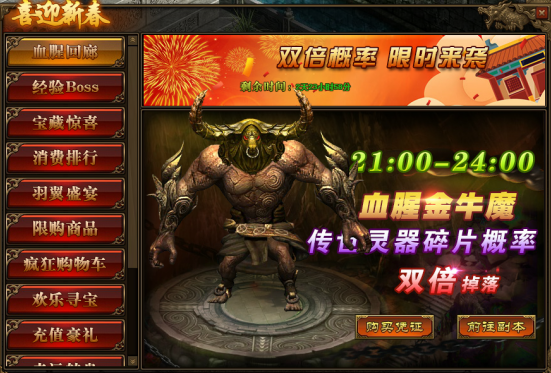 1.活动期间,玩家参与“多人副本-血腥回廊”,获得“传世灵器碎片”的概率翻倍;