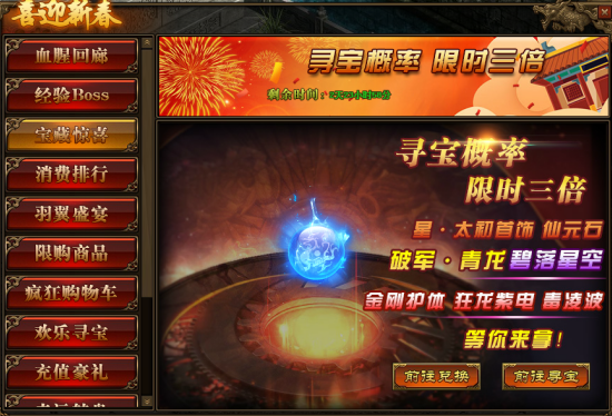 1.活动期间,玩家寻宝概率翻倍,极高几率获得星·太初首饰,特戒钢纹、仙元石、碧落星空,传世灵器、传世灵甲,封神秘法书页以及破军·青龙