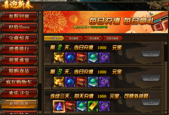 2.连续充值达到3天,奖励翻倍领,更可领取暗影晶石、地狱晶石、随机7级阵法宝珠、雷霆装备等贵重物品