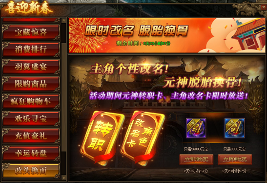 1.活动期间,玩家可在活动面板中购买元神转职卡,让元神脱胎换骨;