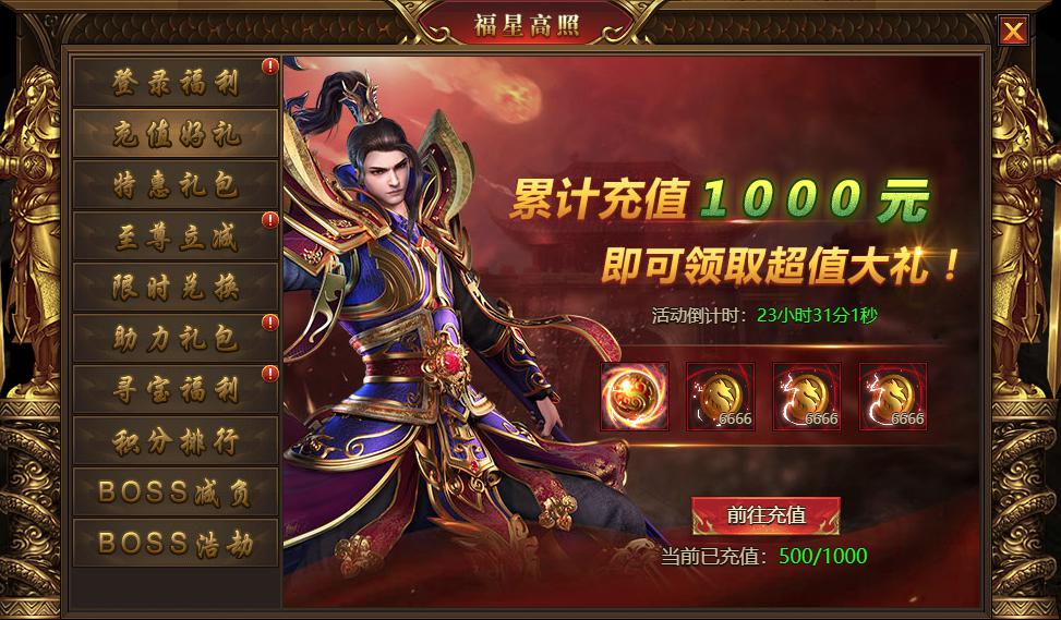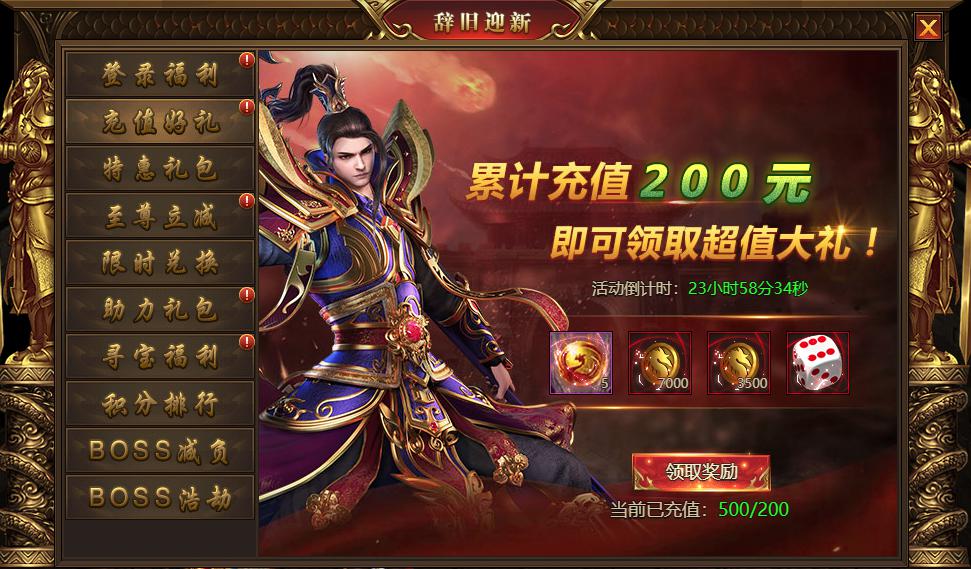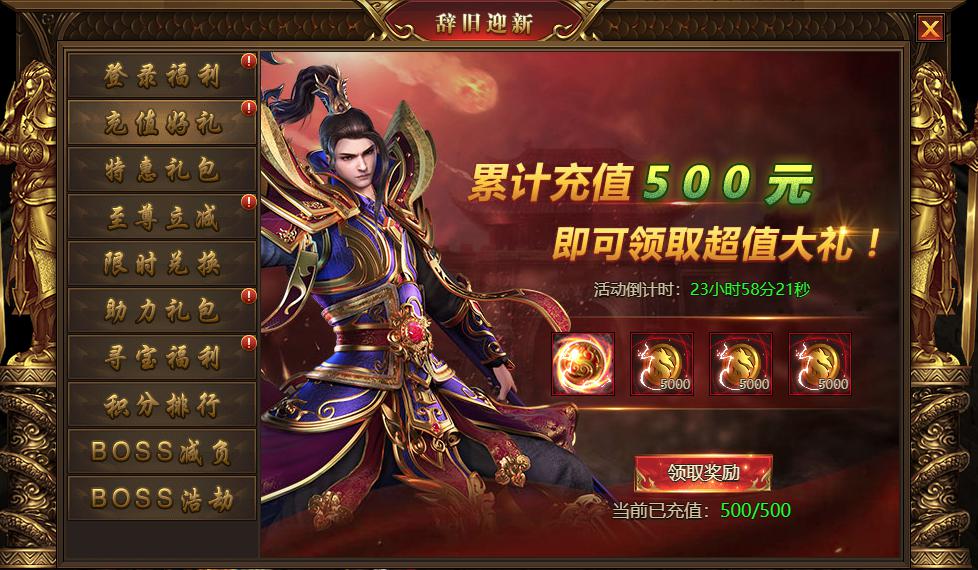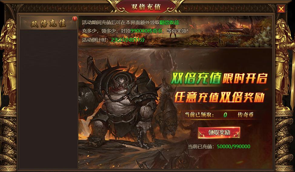 活动内容:活动期间充值可在活动页面领取与充值金额等值的传奇币奖励
