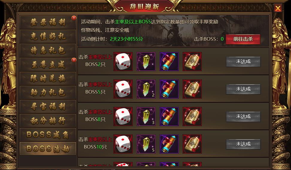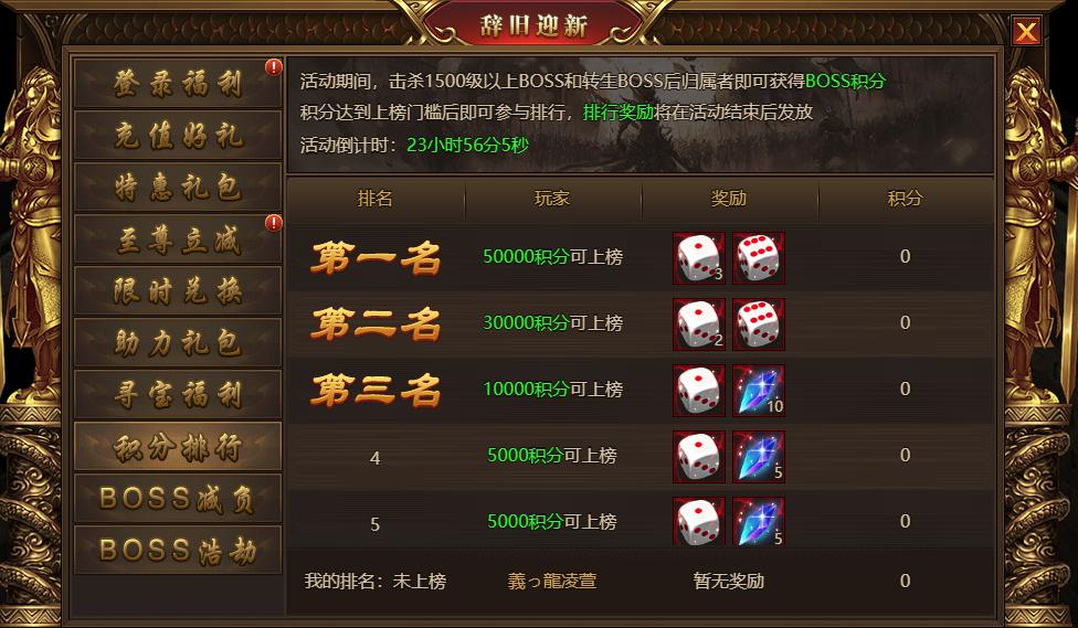 活动内容:活动期间击杀1500级以上的boss和转生boss获得积分,活动结束后更加排行邮件发送奖励