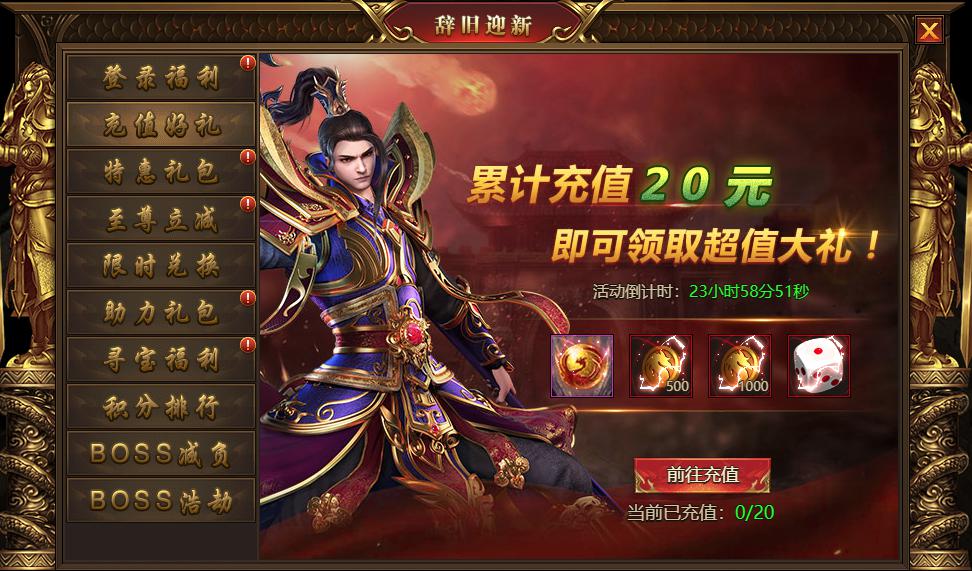 活动内容:活动期间,玩家每日充值20、200、500元、1000元,均可领取超值大礼