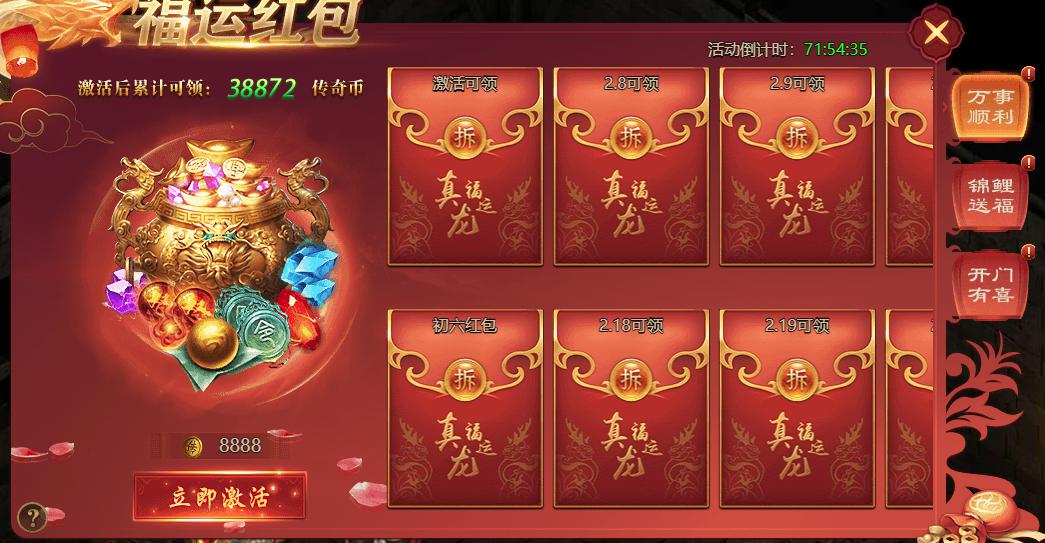 活动内容:活动期间消耗传奇币购买红包,指定天数领取红包大礼