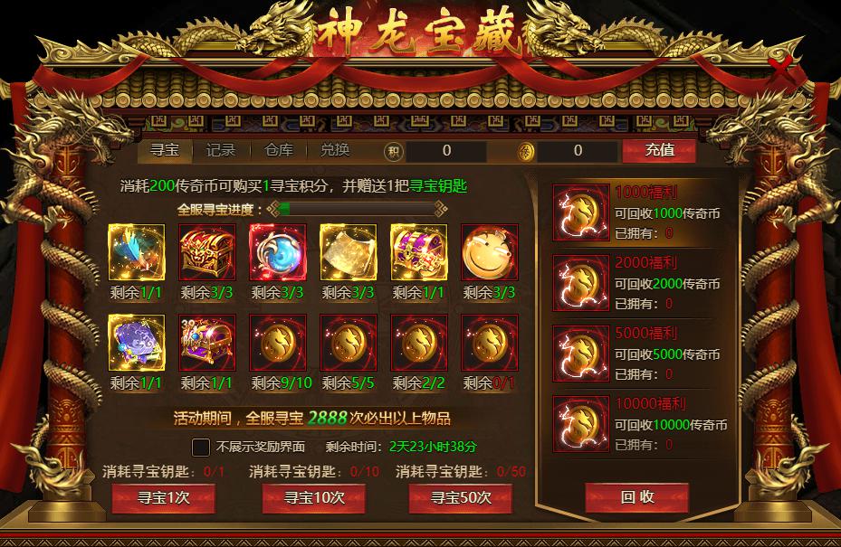 活动内容:活动期间可以在神龙宝藏中抽取各种稀有道具、装备和传奇币