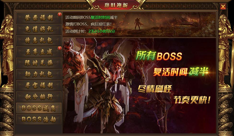 活动内容:活动期间所有boss复活时间减半(跨服boss除外)