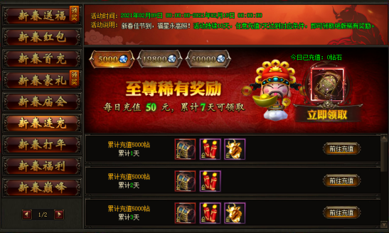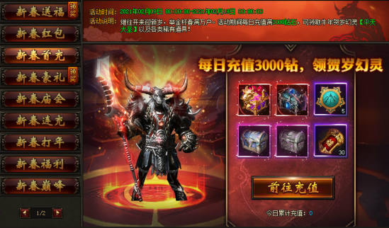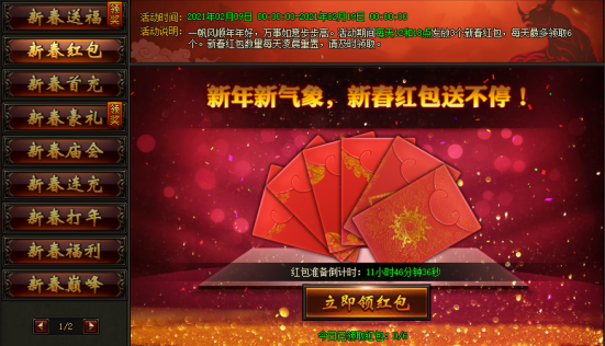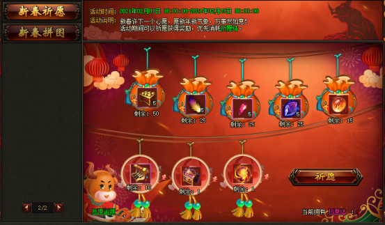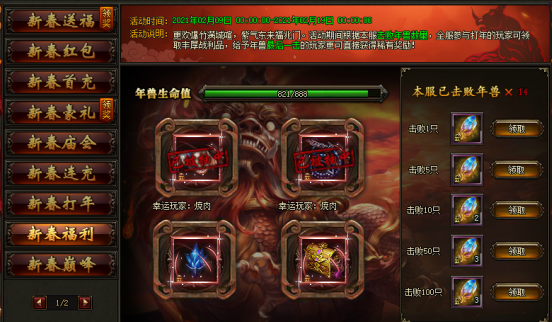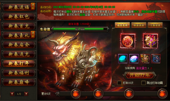 抽奖活动,每次打年会随机扣除年兽生命值,当年兽生命值为0的时候,可获得奖励,全服玩家共享年兽生命值。