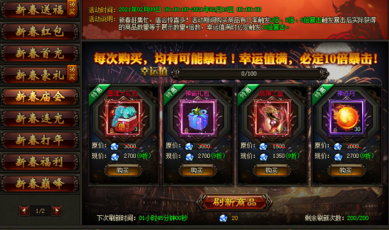 每次购买均有概率暴击,获得暴击倍数的奖励,并增长幸运值,幸运值满后,下一次购买必定10倍暴击并清空幸运值