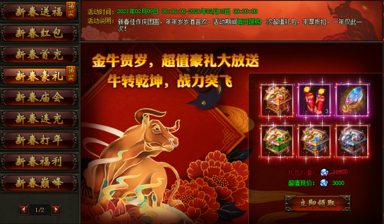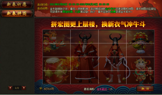 活动期间,消耗金牛碎片激活拼图,获得牛年限定时装、各类稀有奖励,金牛碎片通过签到、连充获得