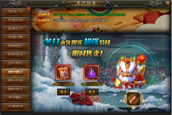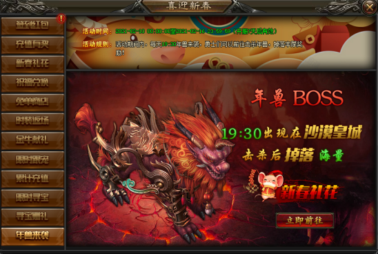 规则:每天19:30在沙漠皇城刷新年兽BOSS,击杀年兽BOSS可获得大量礼花。