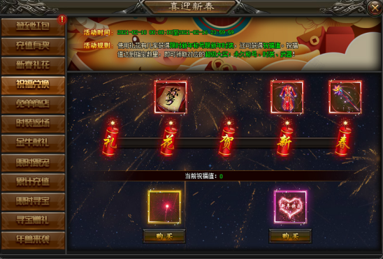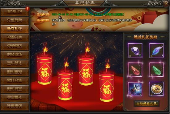 规则:使用普通礼花跟超级礼花可获得祝福值,祝福值达到一定数量时,可领取对应奖励。