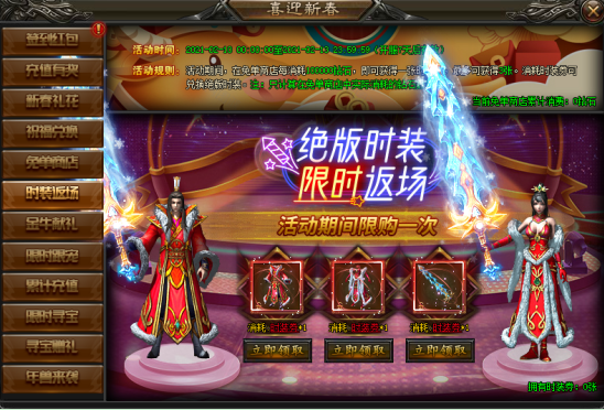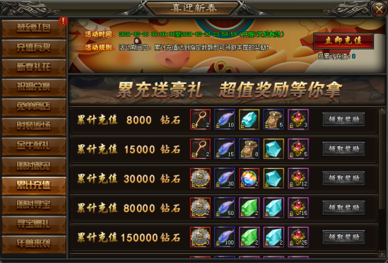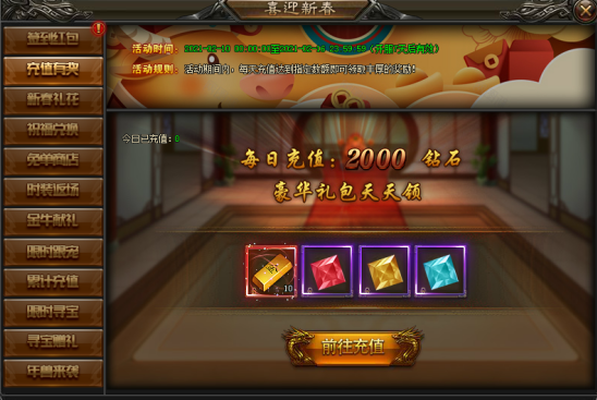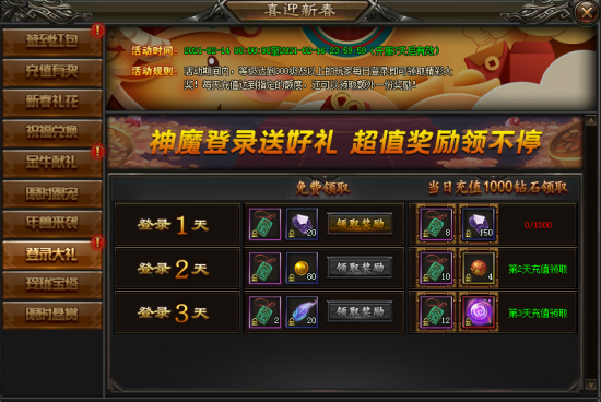 规则:活动期间每天登录即可免费领取超值奖励,同时每天充值1000钻石还可以额外领取一份奖励。