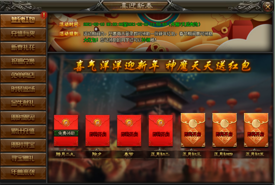 规则:每天登录,即可免费领取一个新年红包,还可花费钻石额外领取一个。