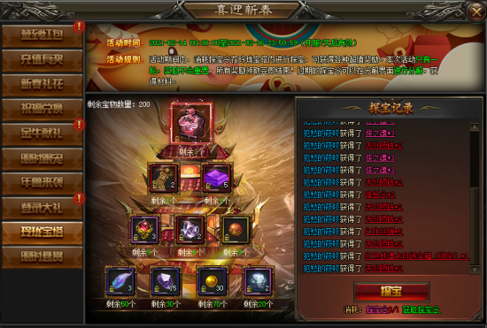 规则:消耗探宝令在玲珑宝塔中探宝,活动只有一轮,奖励抽完为止,不会重置。