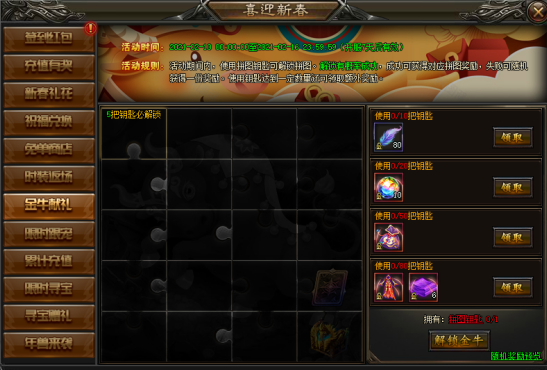 规则:使用拼图钥匙解锁金牛,每次解锁有概率成功。成功后可获得对应的拼图奖励,失败后可随机获得一份奖励。使用拼图达到一定次数,还可获得大奖。