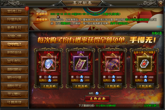 规则:活动期间,每隔2小时免单商店将会刷新各种市面上难以获取的珍贵物品,还可以消耗钻石手动刷新商店。每次购买都有几率免单,免单不消耗钻石。