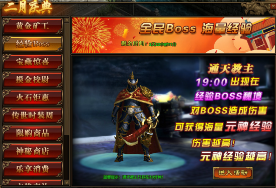 2.活动中,玩家对BOSS造成的伤害,将在活动结束后转换成元神经验并发放;