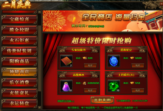 2.神秘商店每2小时自动刷新一次,也可用花费元宝立即刷新;