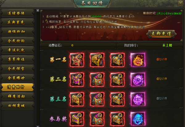 活动说明:活动期间,累计消费达到300000钻石的玩家参与排行,上榜的玩家奖励在活动结束后以邮件的方式进行发放