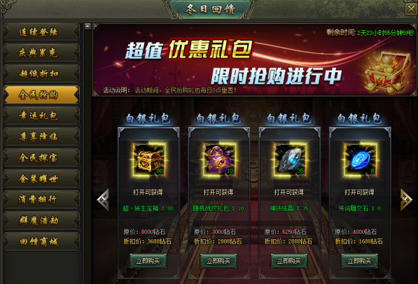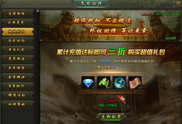 活动说明:活动期间,累计充值一定钻石即可超低折扣购买礼包
