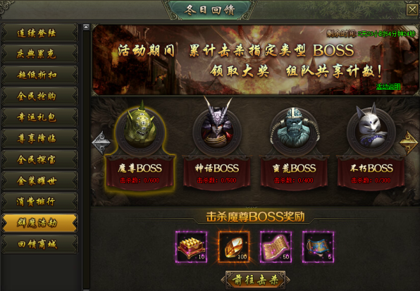 活动说明:活动期间,累计击杀指定类型BOSS,可领取超值奖励!