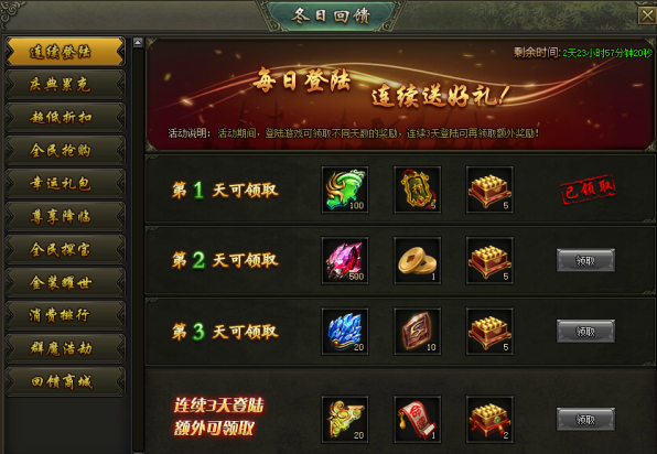 活动说明:活动期间,登陆游戏可领取不同天数的奖励,连续3天登陆可再领取额外奖励