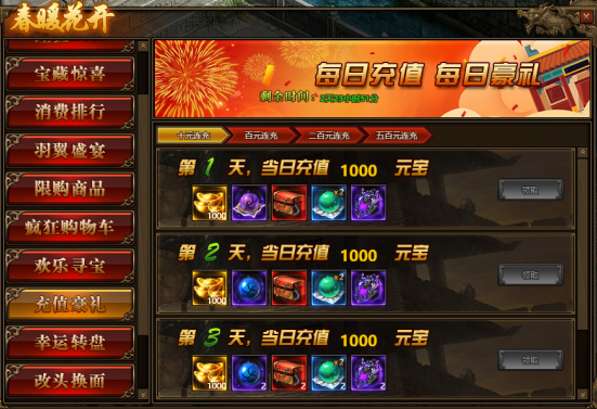 2.连续充值达到3天,奖励翻倍领,更可领取暗影晶石、地狱晶石、随机7级阵法宝珠、雷霆装备等贵重物品