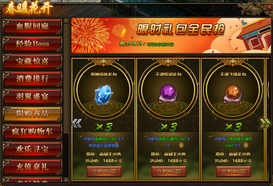 1.活动期间,玩家可在活动面板购买限购商品;(可翻页)