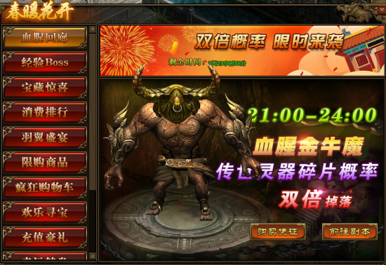 1.活动期间,玩家参与“多人副本-血腥回廊”,获得“传世灵器碎片”的概率翻倍;