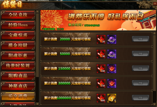 1.活动期间,玩家累计消费满足要求,可以领取境界修为、本职业星石、传世灵戒等相应奖励;