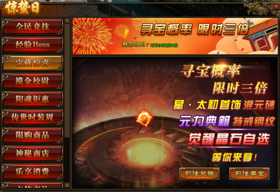 1.活动期间,玩家寻宝概率翻倍,极高几率获得星·太初首饰,传世灵器、传世灵甲,特戒钢纹,混元砂,传世灵器、传世灵甲,不灭意志典籍、元力回响典籍以及觉醒晶石自选宝箱