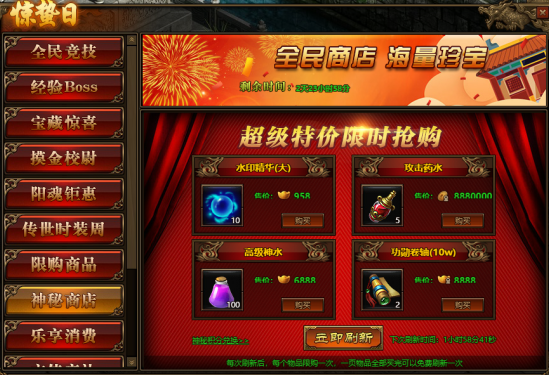 1.活动期间,玩家可在神秘商店中购买商品,商品可用金币,绑元,元宝进行购买;