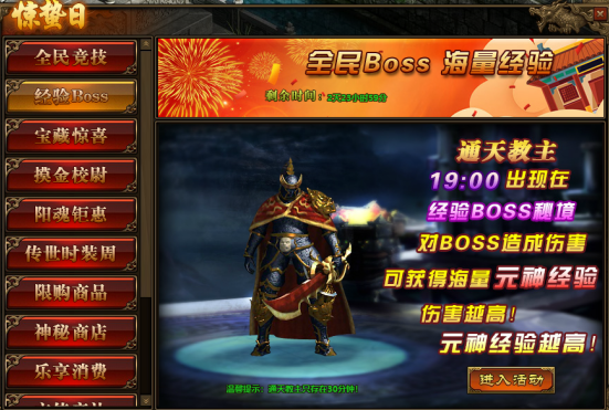 2.活动中,玩家对BOSS造成的伤害,将在活动结束后转换成元神经验并发放;