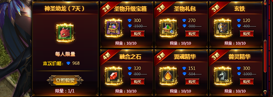绑钻包*5、黑市礼券*2、神力结晶、锻造宝石、玄铁、护盾升级石、2倍经验药水、2.5倍经验药水、中型生命药包、攻速卷轴、攻击卷轴、防御卷轴、生命卷轴、卓越一击卷轴、幸运一击卷轴、紫色魔法章节宝箱、利刃之锋技能书,神之护佑技能书、血腥气息技能书、坚甲之韧技能书。