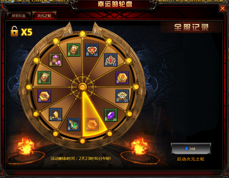 活动内容:玩家在活动时间内,使用68钻石可购买一次转盘机会,每获得5个次元要是可开启一分钟的次元之轮,次元之轮每次需要168钻石,奖励丰厚不容错过!