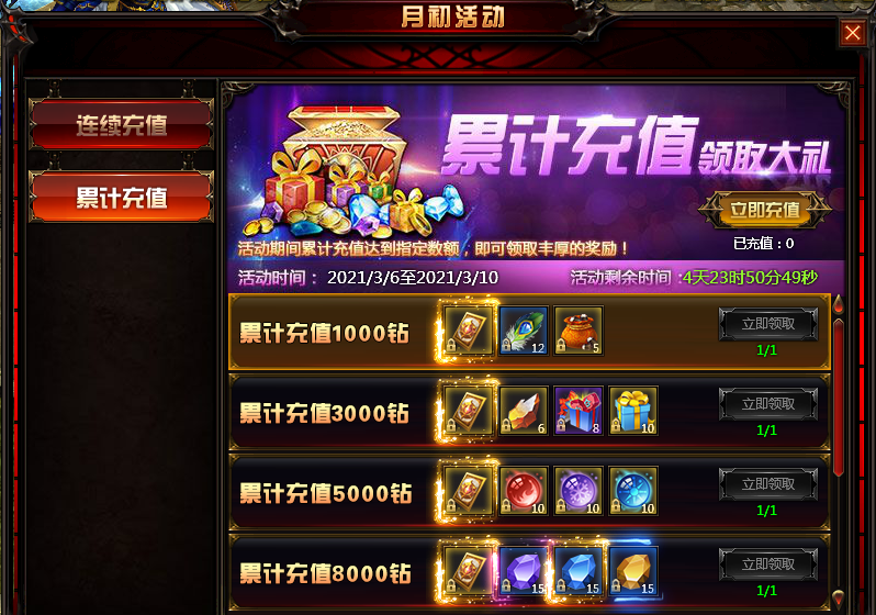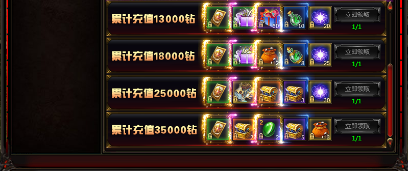 活动内容:玩家在活动时间内,累计充值达到一定钻石即可获得丰厚礼品,超值奖励等你来拿!