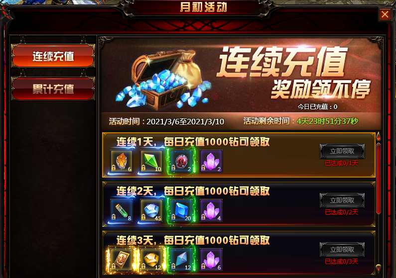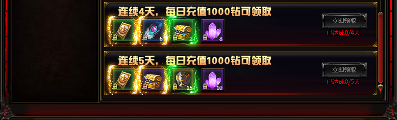 活动内容:活动时间内,玩家每日充值达到1000钻,即可获得丰厚奖励!