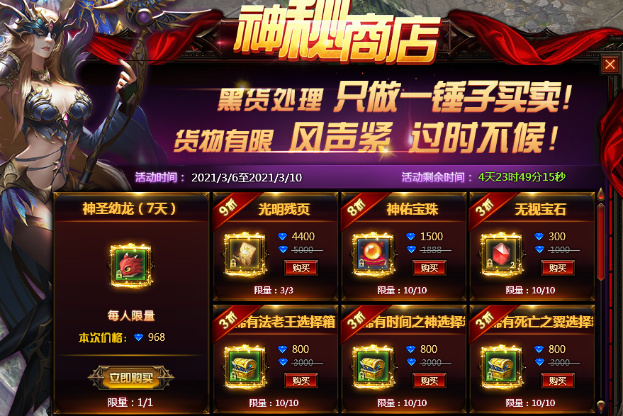 活动内容:神秘商品限时折扣,货物稀有,难得一见,快来选购吧。