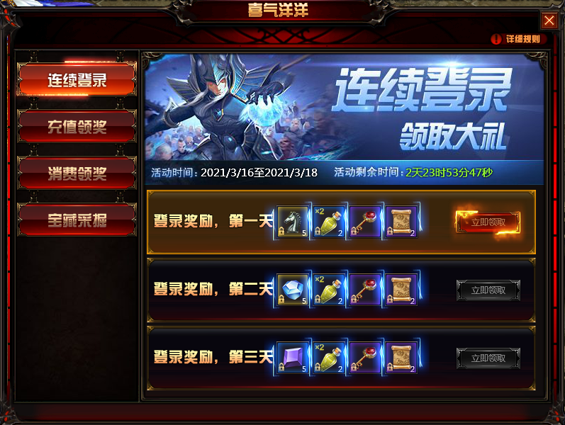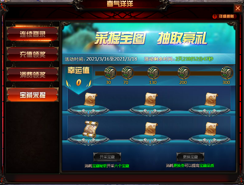 活动内容:玩家在活动时间内,可领取活动期间每日登陆可以获得1个“宝藏秘钥”,2张“更改券”。