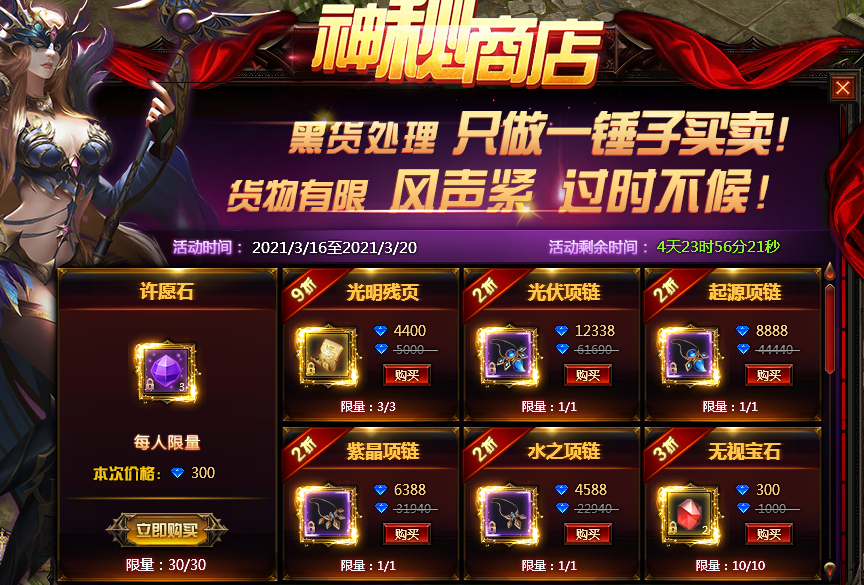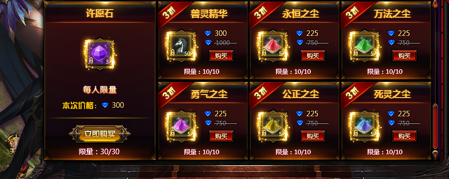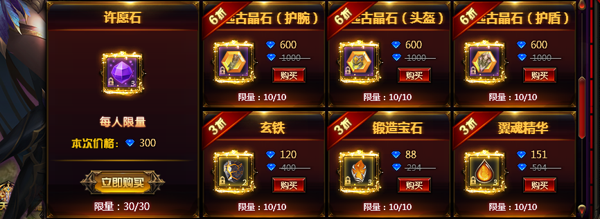3. 玩家也可以在神秘商店中购买许愿石许愿,许愿石许愿必得稀有品质以上宝箱。