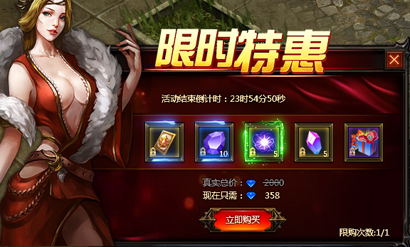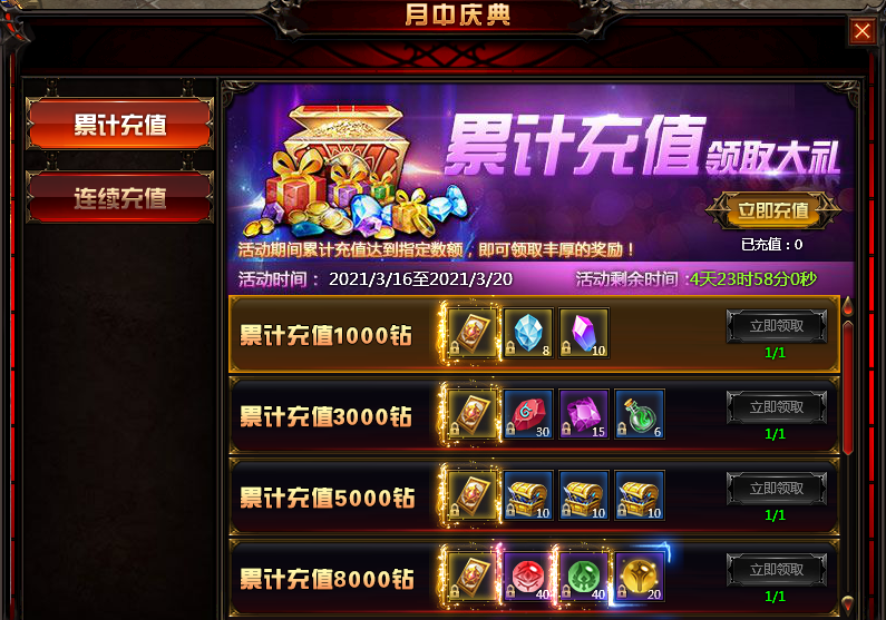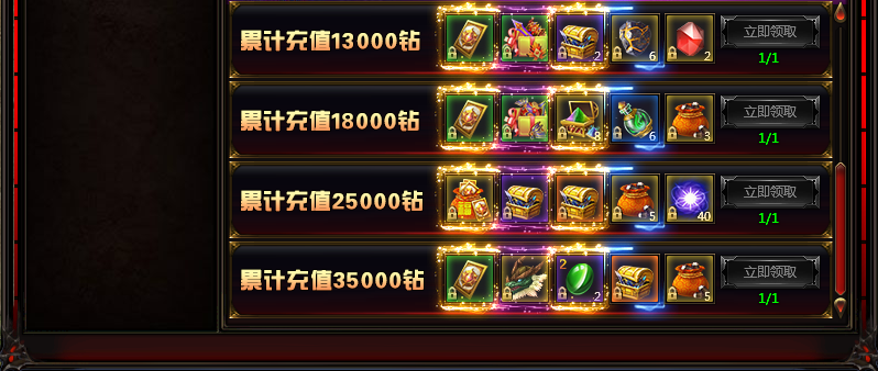 活动内容:玩家在活动时间内,累计充值达到一定钻石即可获得丰厚礼品!