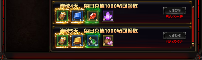 活动内容:活动时间内,玩家每日充值达到1000钻,即可获得丰厚奖励!