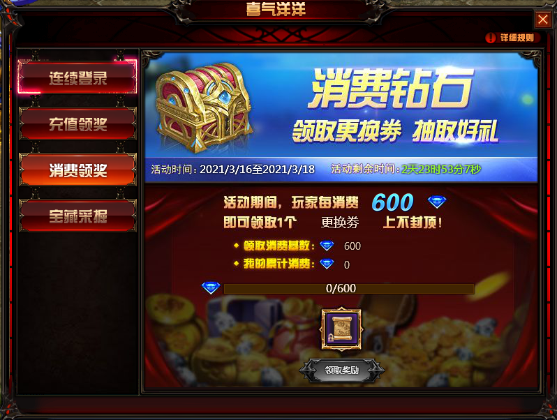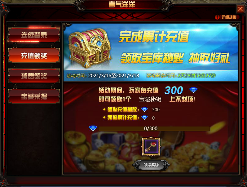 每充值300钻石可获得1个“宝藏秘钥”,每消费600钻石可获得1个“更换券”。