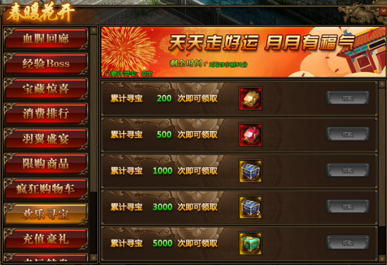 1.活动期间,玩家累积寻宝次数满足要求,可以领取高级天魂石等相应奖励;